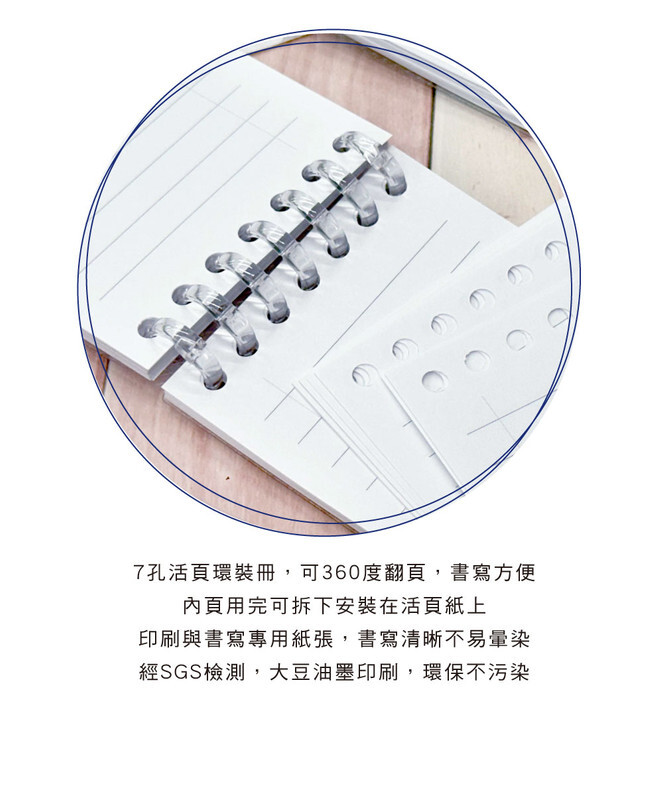 ◆7孔活頁環裝冊,可360度翻頁。