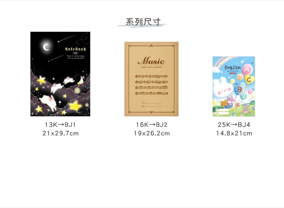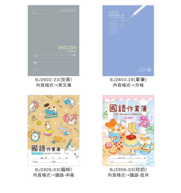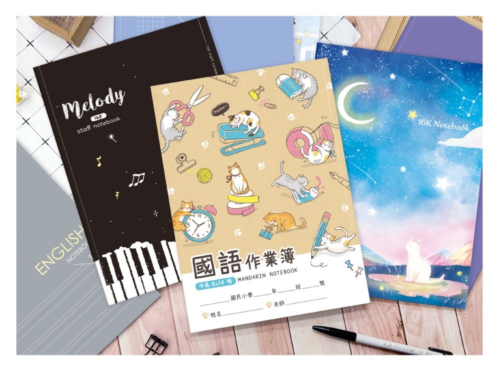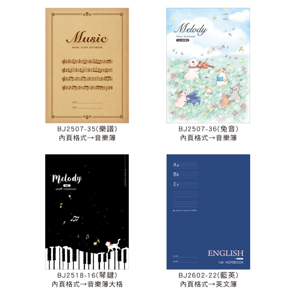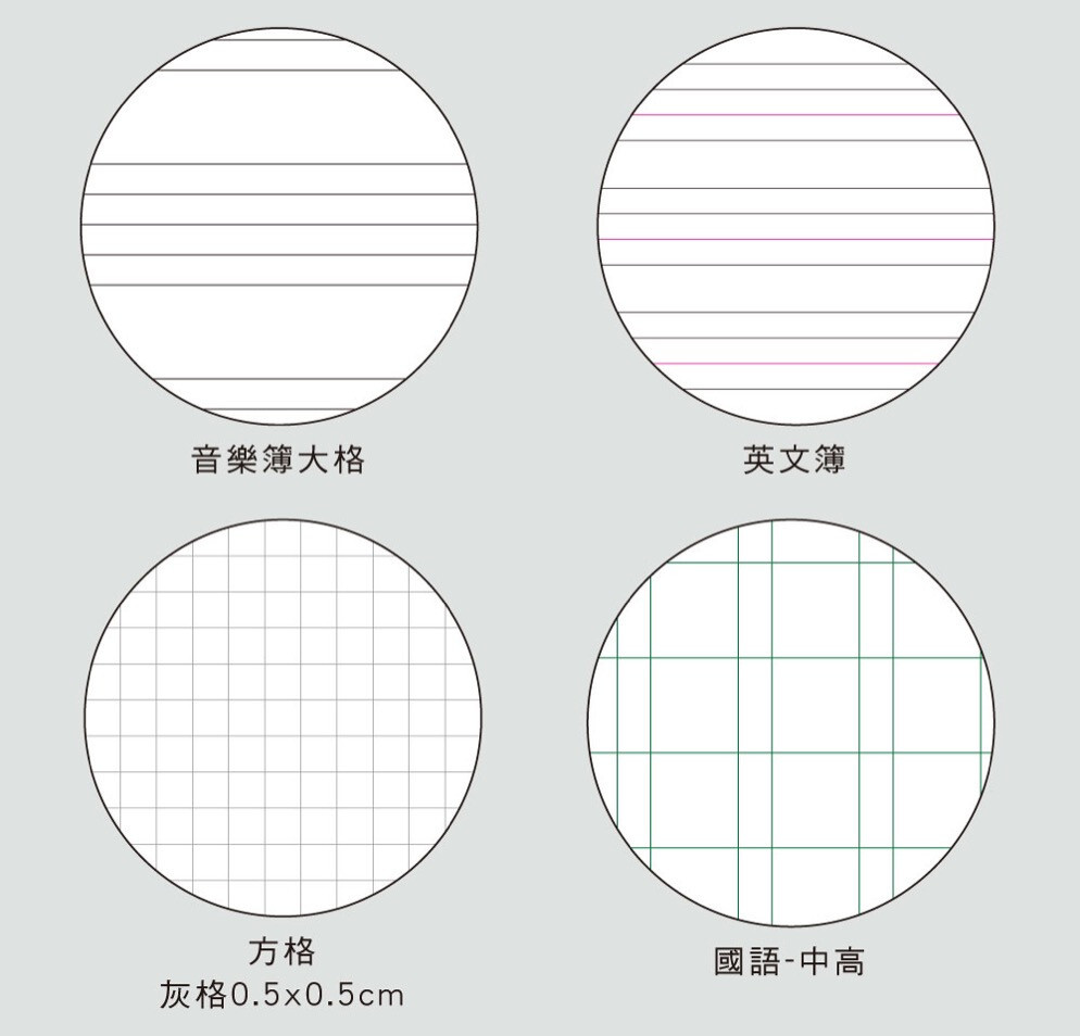 ◆有橫線、大格、空白、音樂簿、英文、方格、國語等款式。