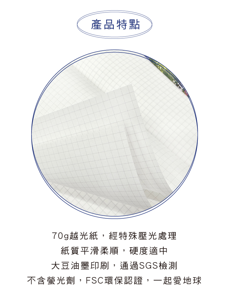 ◆內頁採用70g越光紙,紙質滑順好書寫,紙色柔和。