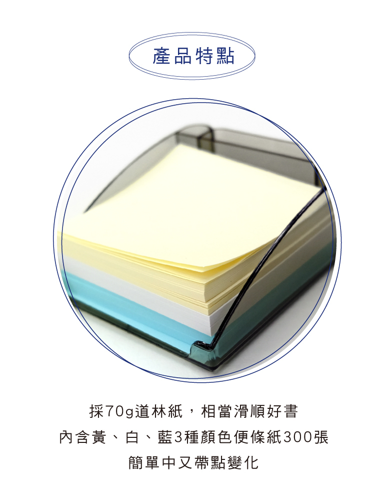 ◆內含黃、白、藍3種顏色便條紙,共300張。