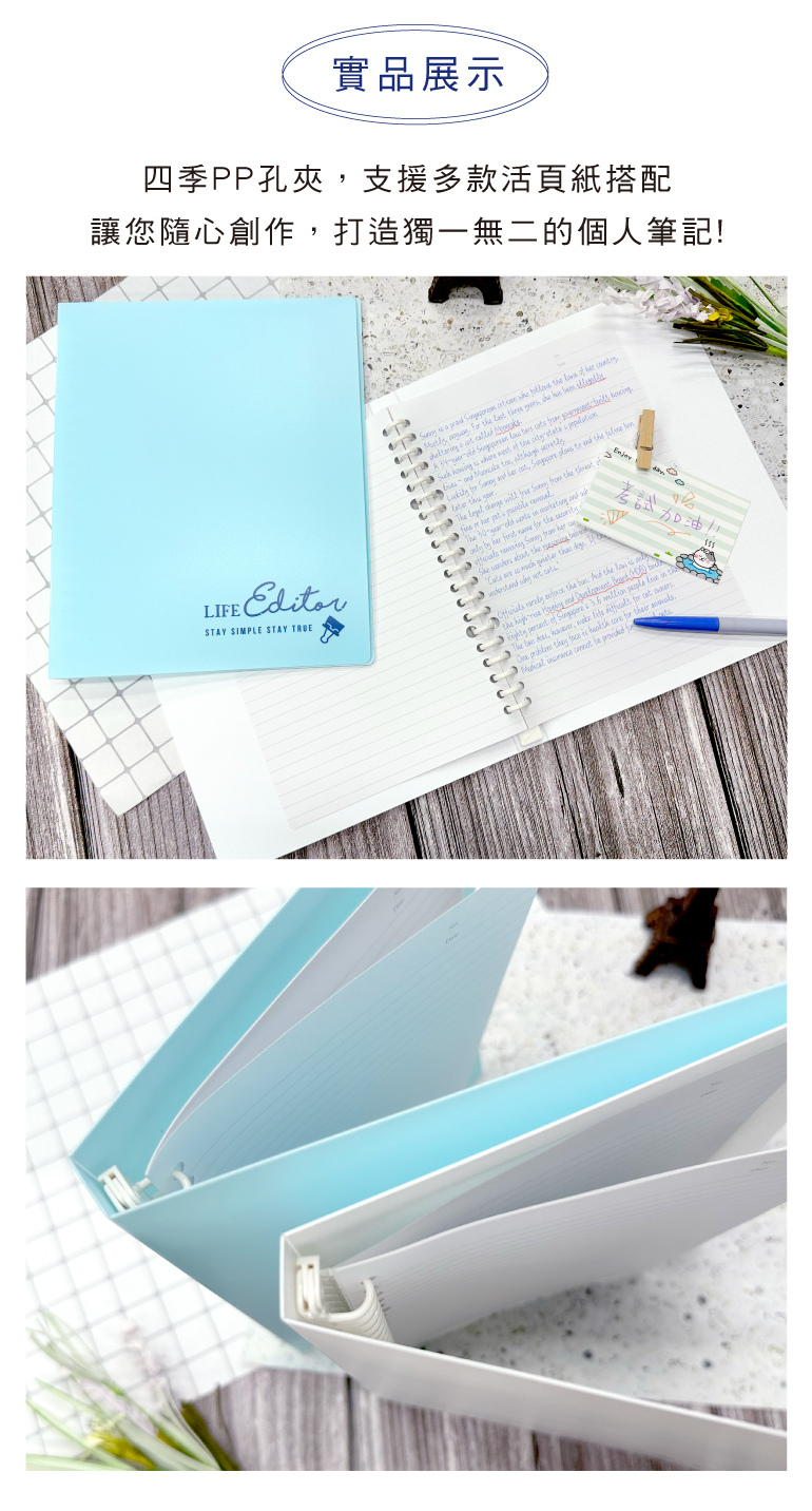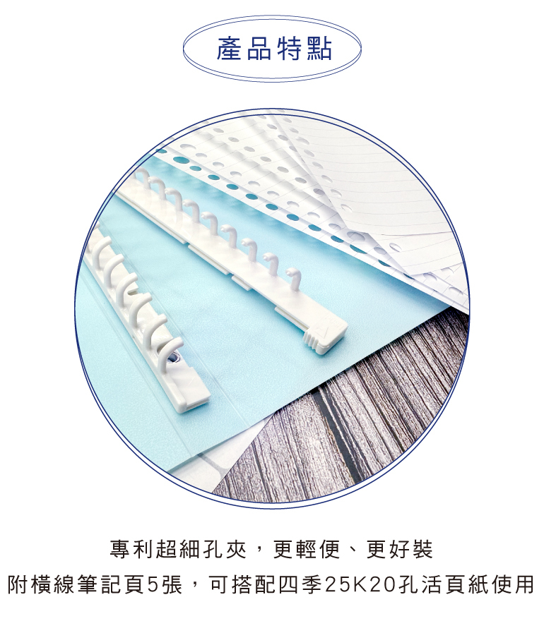 ◆專利超細孔夾,輕便好裝,可搭配四季25K20孔活頁紙。