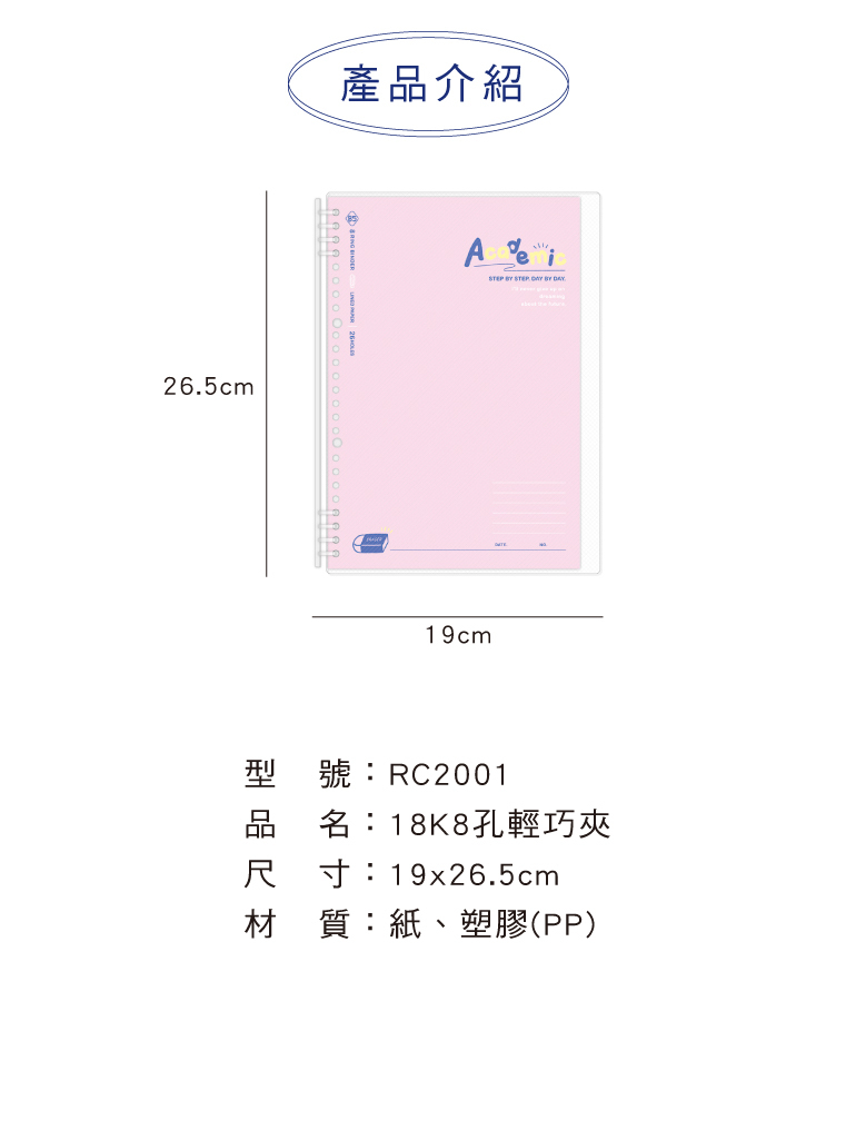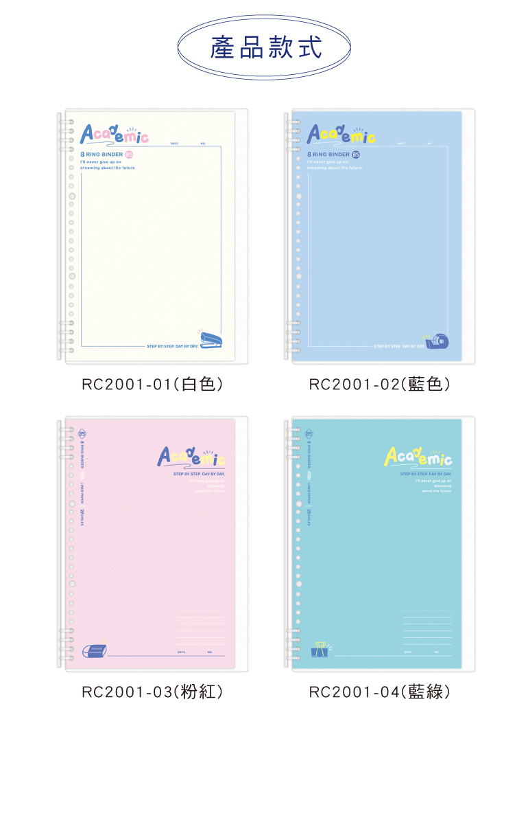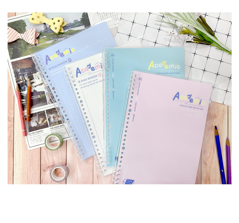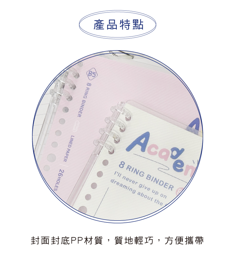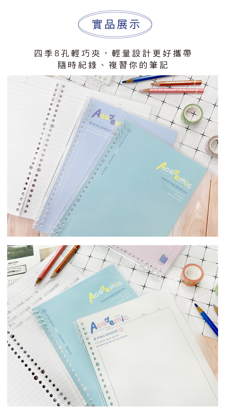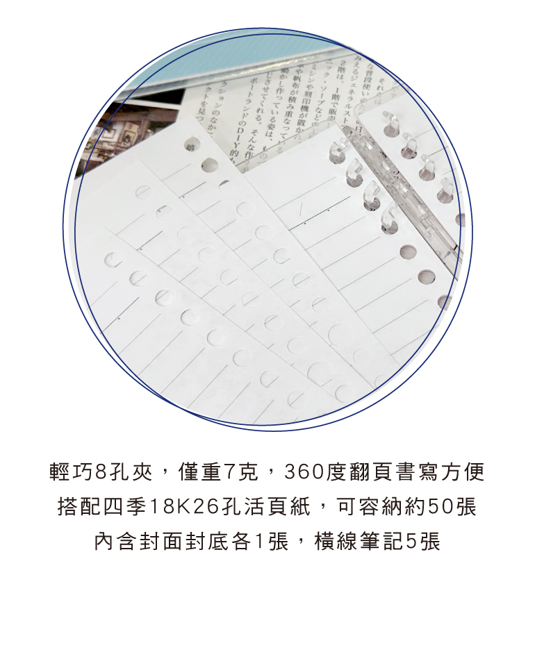 ◆輕巧8孔夾,360度翻頁書寫方便。