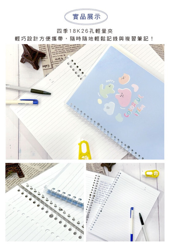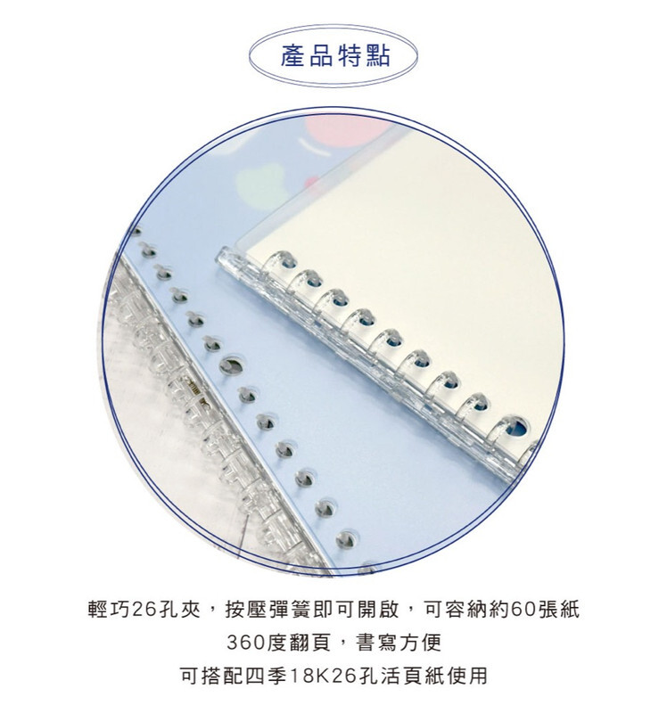 ◆輕巧26孔夾,360度翻頁書寫方便,可容納約60張紙。