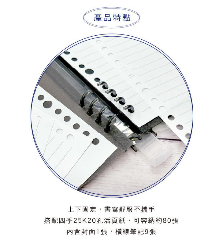 ◆搭配四季25K20孔活頁紙,可容納約80張。