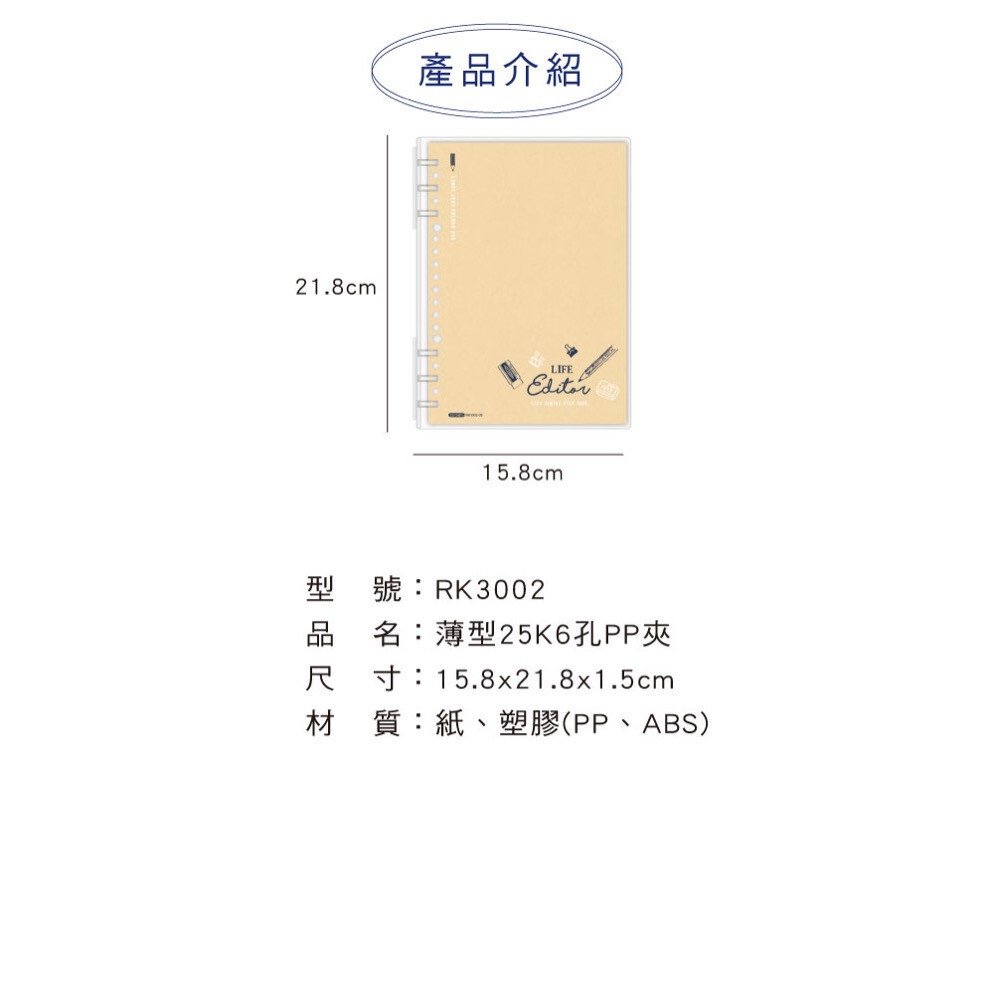 ◆四季紙品 薄型25K6孔PP夾 【RK3002】