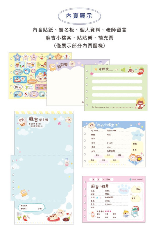 ◆內含貼紙、簽名板、個人資料、老師留言、麻吉小檔案、貼貼樂、補充頁。