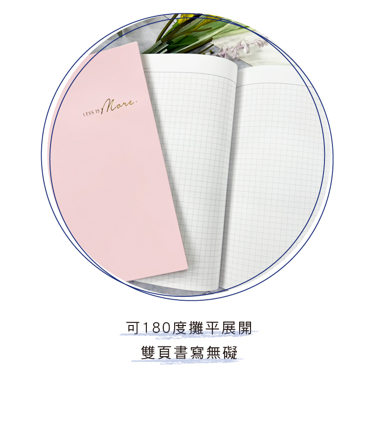 ◆可180度攤平展開,雙頁書寫無礙。