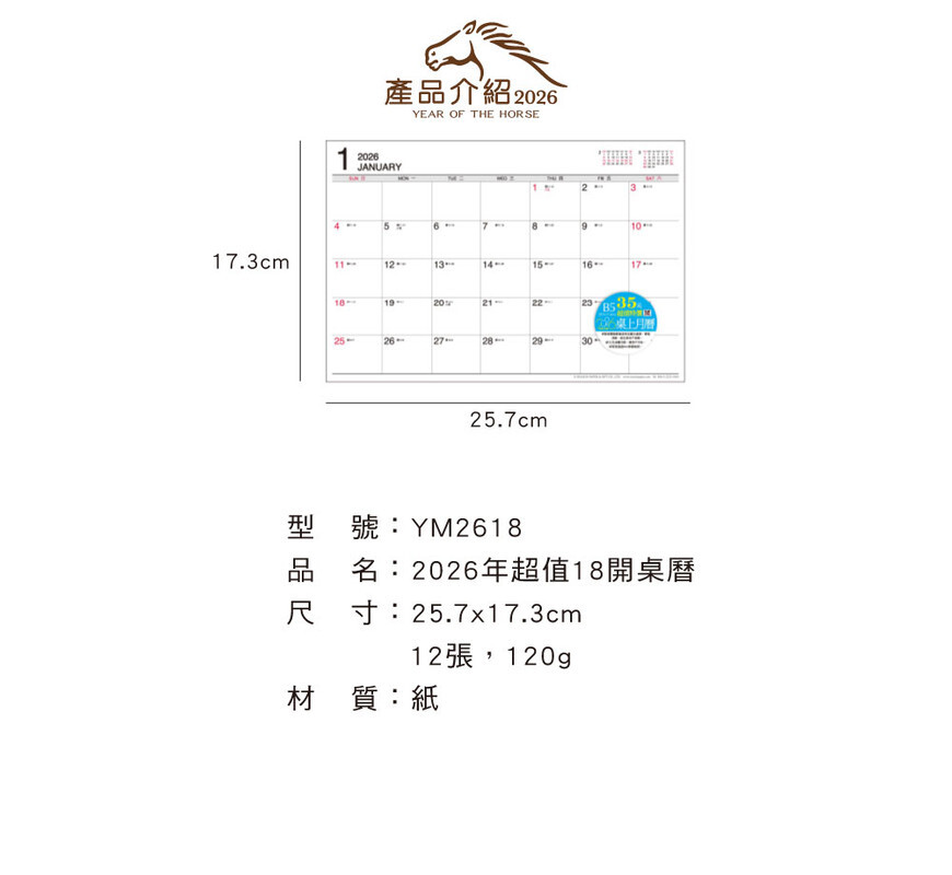 ◆四季紙品 2026年超值18開桌曆 【YM2618】