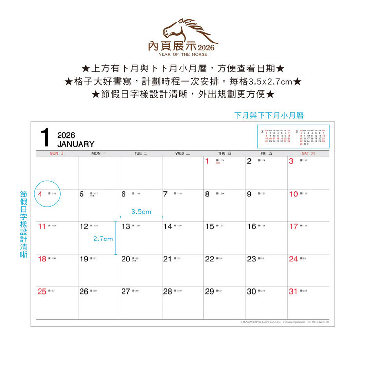 ◆節假日字樣設計清晰,書寫欄位大,計劃時程一次安排。