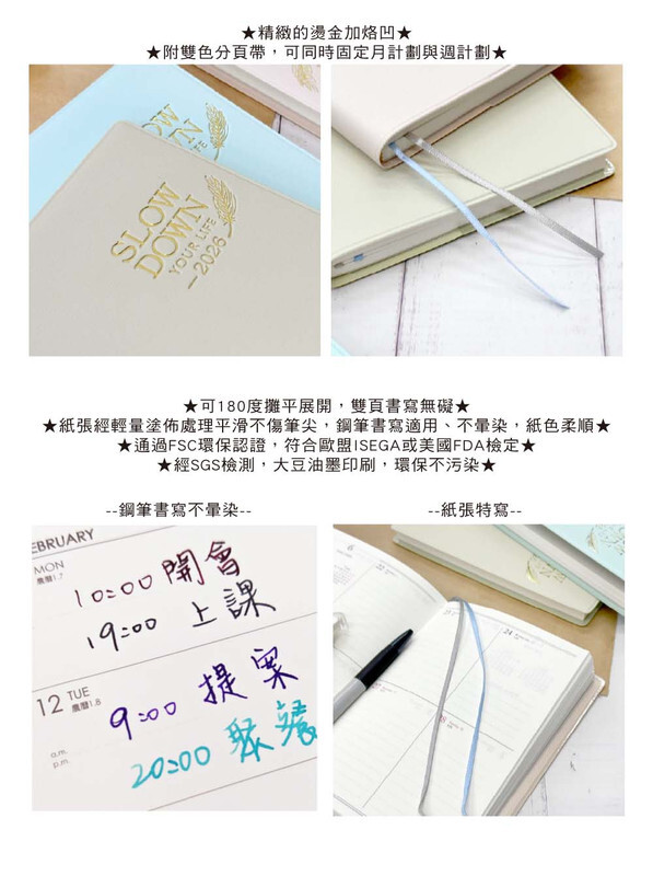 ◆紙張經輕量塗布處理,鋼筆書寫適用,不暈染,紙色柔順。