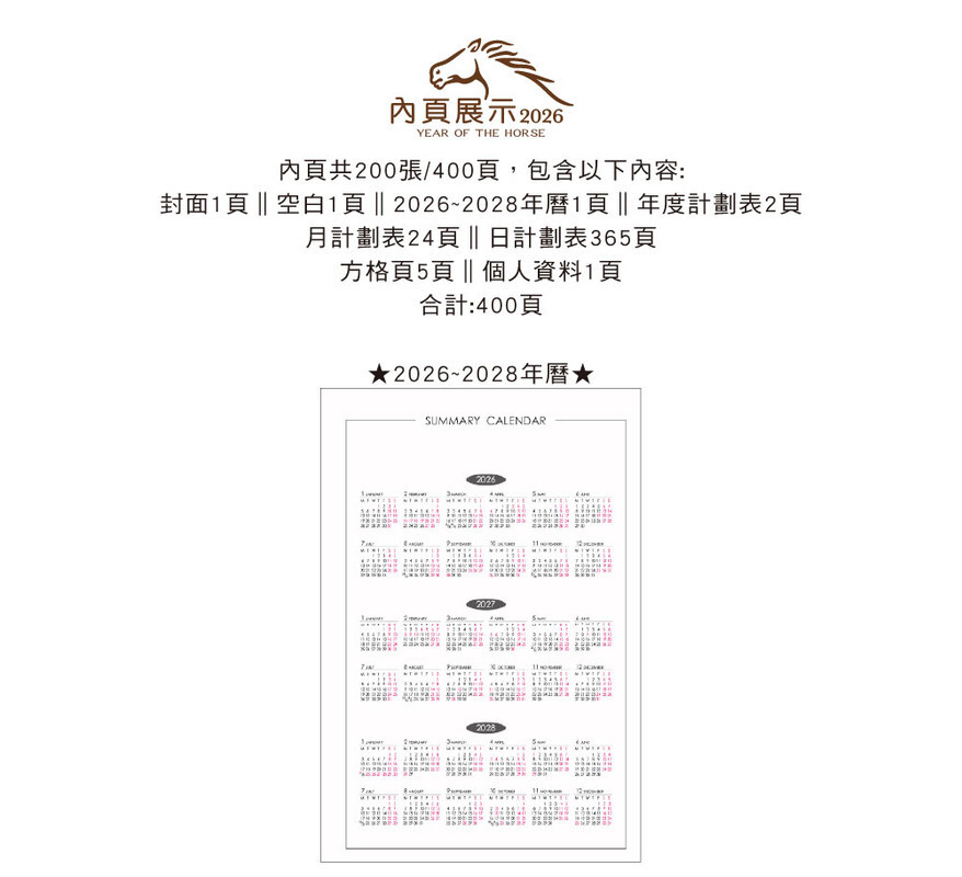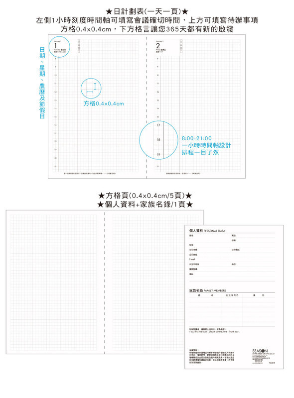 ◆內含:年曆/年計劃/月計劃/日計劃/方格頁/個人資料