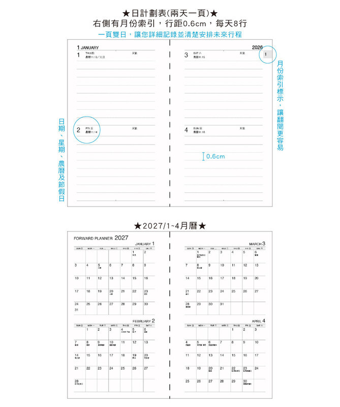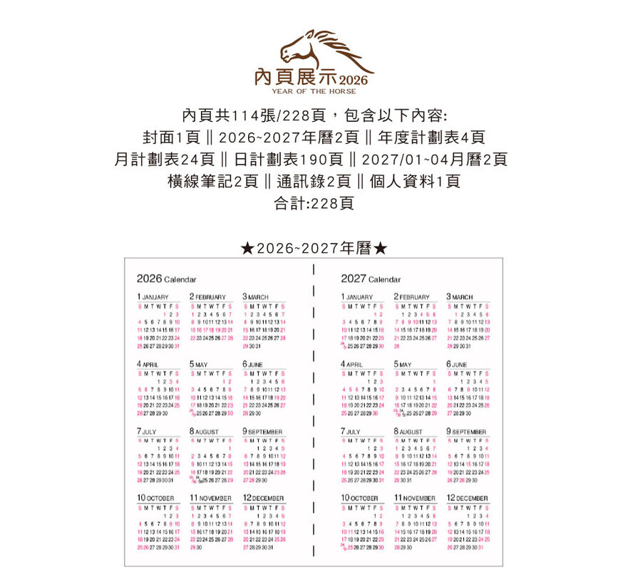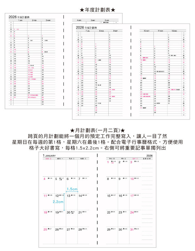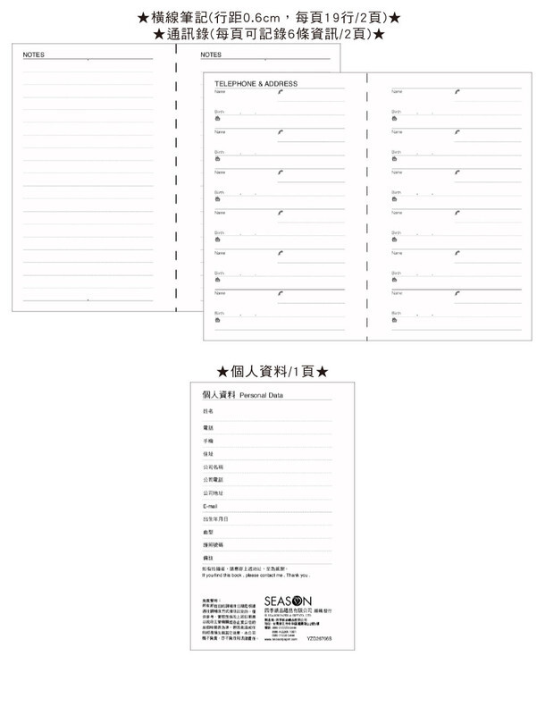 ◆內含:年曆/年計劃/月計劃/日計劃/月曆/通訊錄/橫線筆記/個人資料