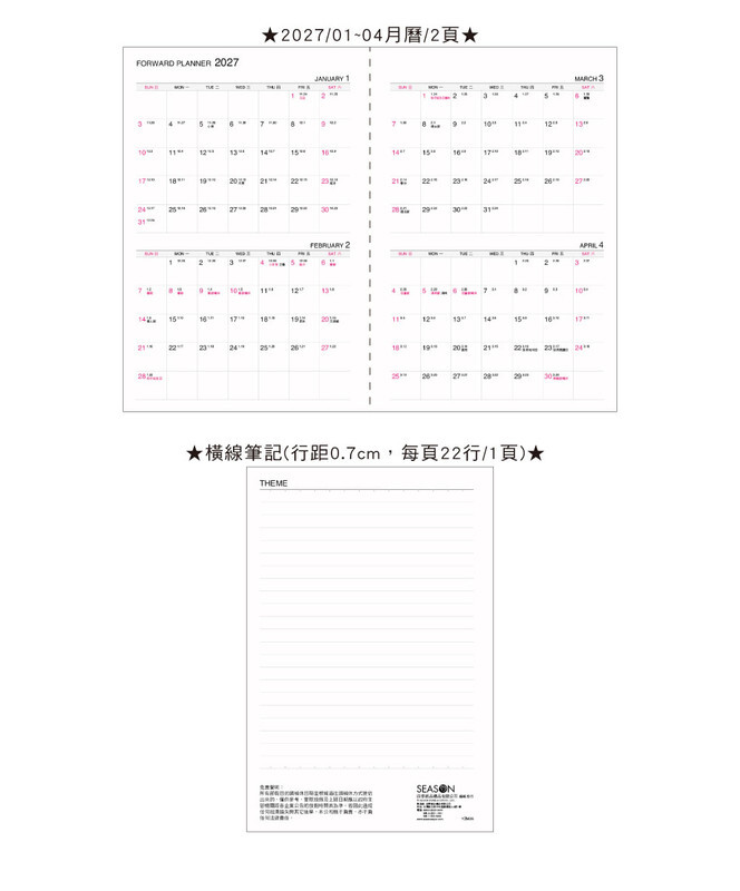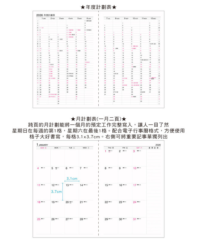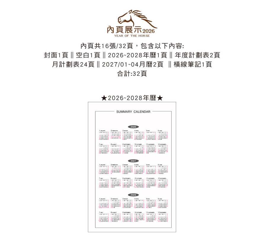 ◆內含:年曆/年計劃/月計劃/月曆/橫線筆記