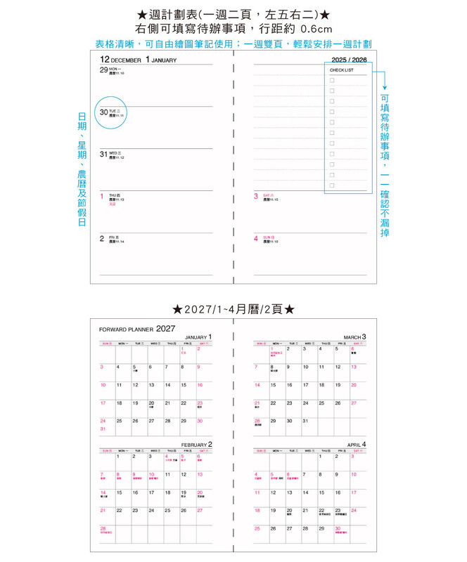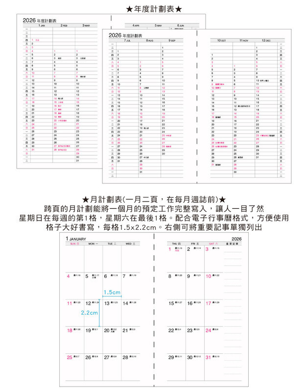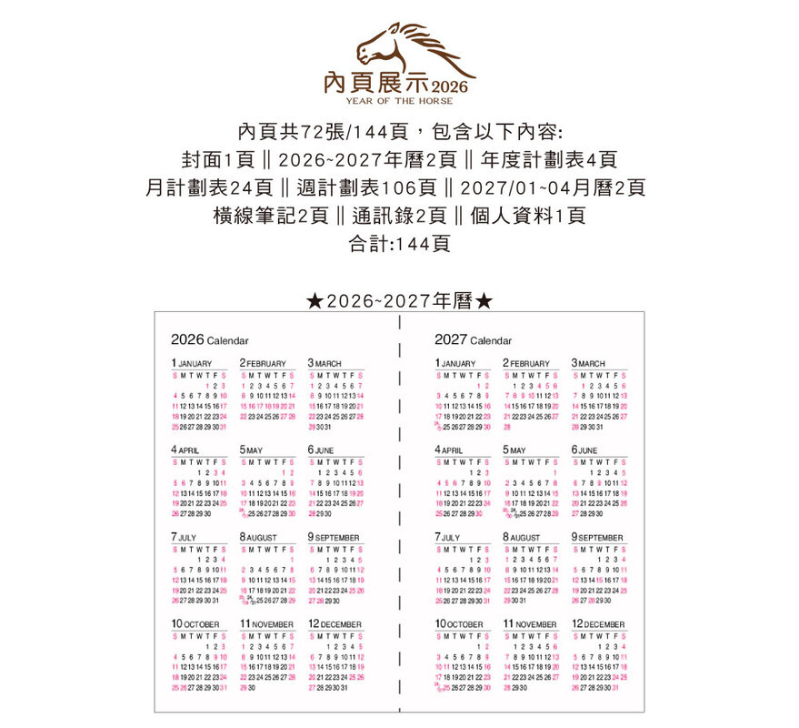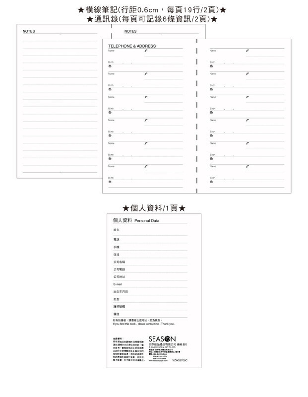 ◆內含:年曆/年計劃/月計劃/週計劃/通訊錄/橫線筆記/個人資料