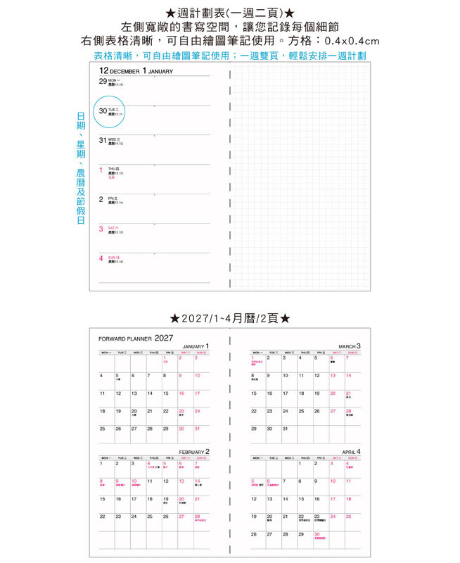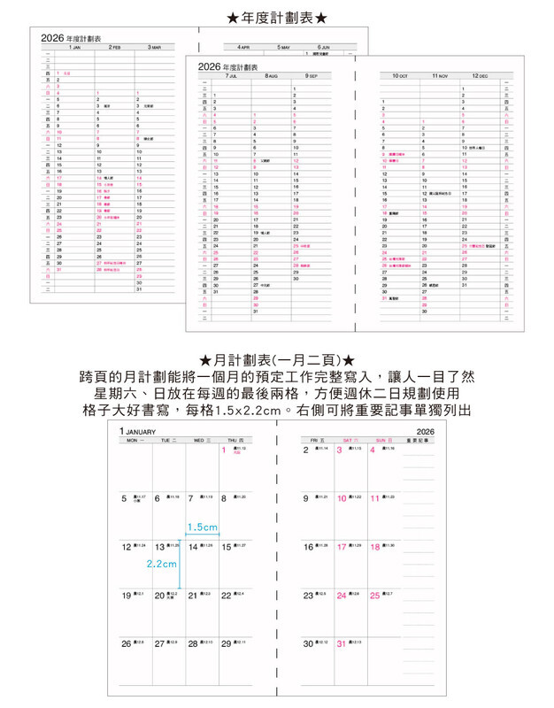 ◆內含:年曆/年計劃/月計劃/週計劃/通訊錄/橫線筆記/個人資料