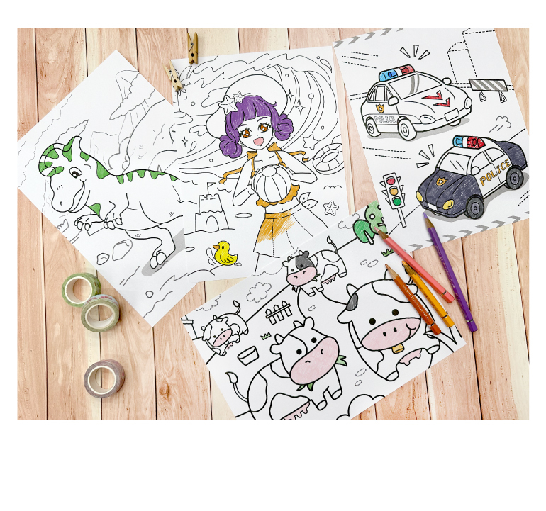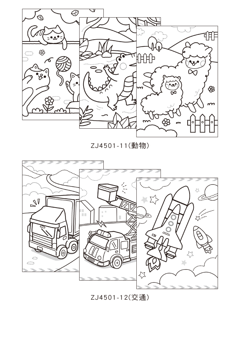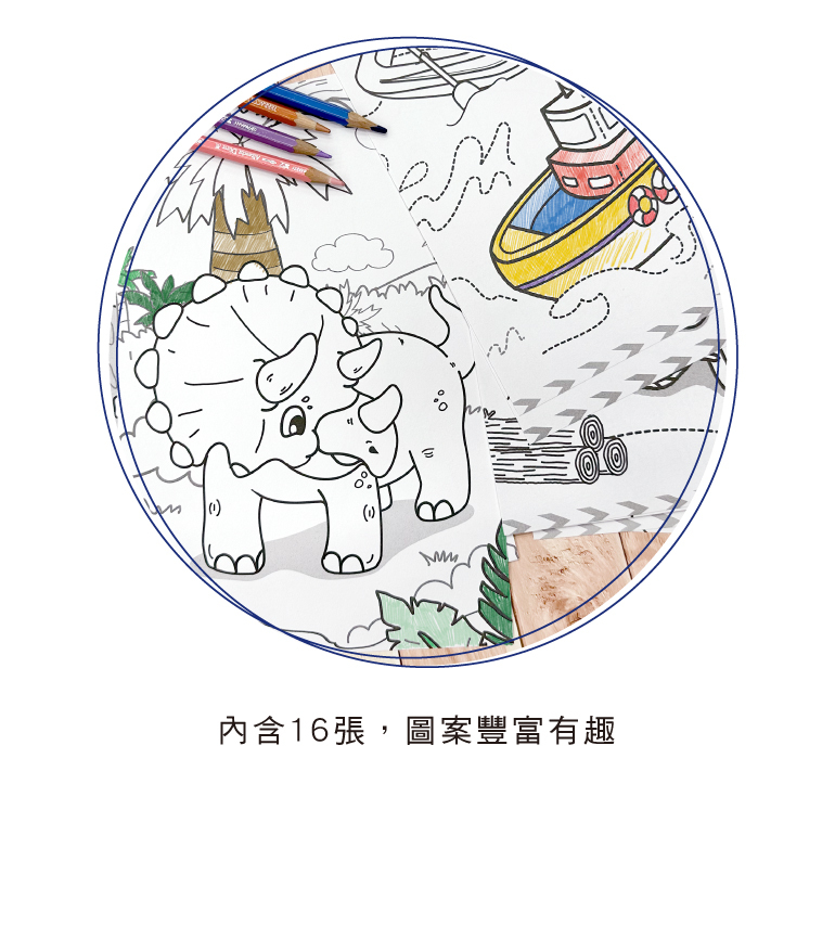 ◆內含16張著色紙,圖案豐富有趣。