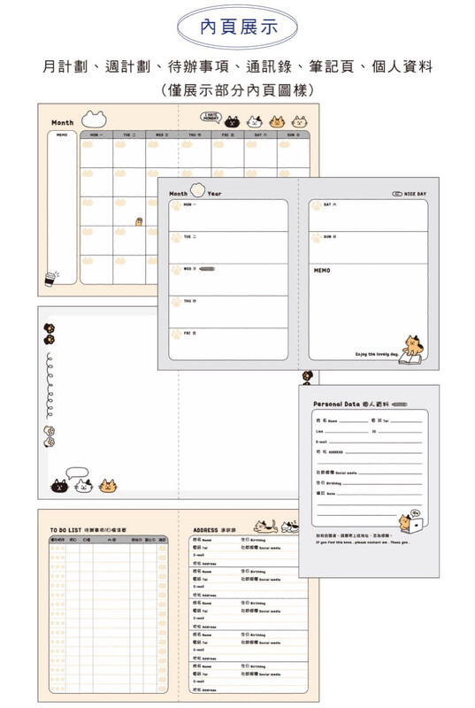 ◆內含月計劃、週計劃、待辦事項、通訊錄、筆記頁、個人資料。